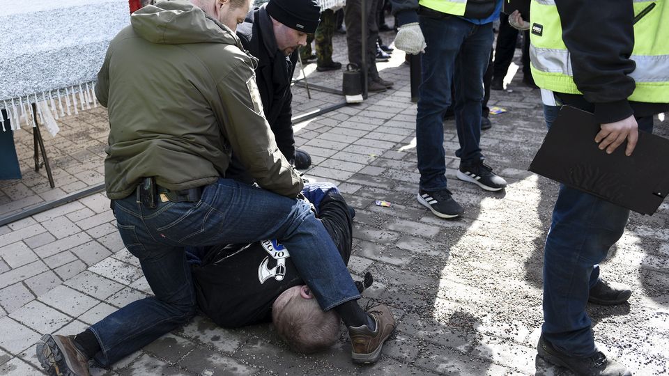 Охранники скрутили нападавшего, одетого в курту, украшенную нашивками экстремистской организации Soldiers of Odin.