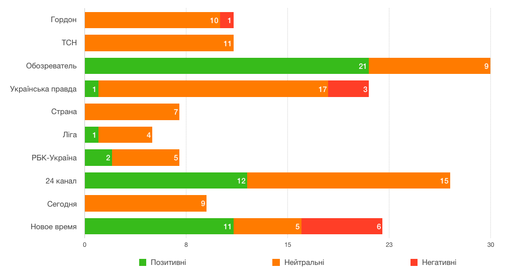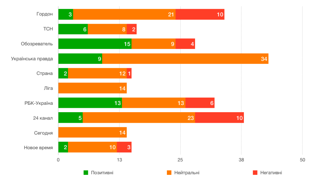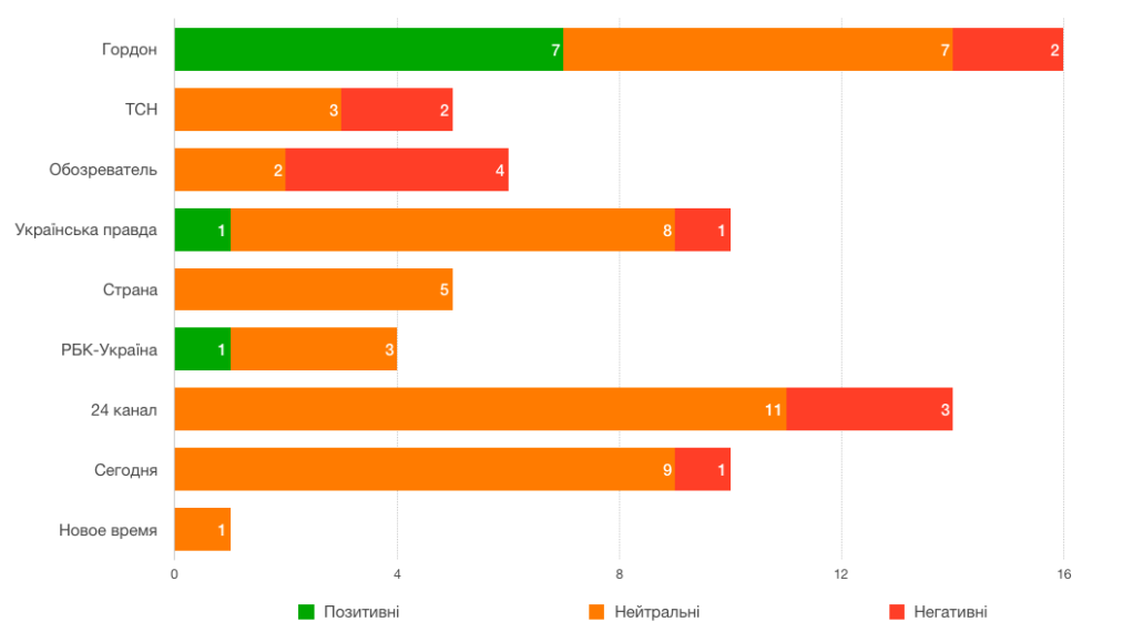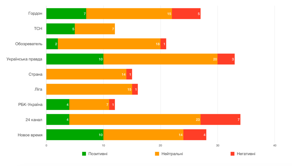 Далі експерти оцінили інформаційні повідомлення зі згадуваннями про кандидатів на предмет тональності (позитивна, негативна чи нейтральна). До позитивних належали тексти, у яких кандидат згадується в позитивному світлі, використовуються його чи її заяви без коментарів іншої сторони конфлікту, експертів з теми, з якої кандидат висловлюється, новини з ознаками компліментарності на користь кандидата тощо. До нейтральних належали тексти, в яких дотримувався стандарт повноти думок, сама новина була збалансована, згадка про кандидата не супроводжувалася жодними оціночними судженнями. До негативних належали всі тексти, де критика діяльності кандидата не супроводжувалася відповіддю іншої сторони, експертів з іншою точкою зору, використовувалися негативні оціночні судження щодо кандидата, маніпуляції тощо.