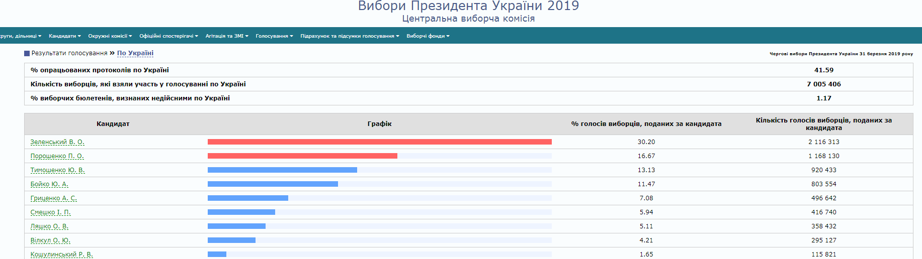 По результатам обработки 41,59% бюллетеней лидерство в первом туре президентских выборов удерживает Владимир Зеленский.