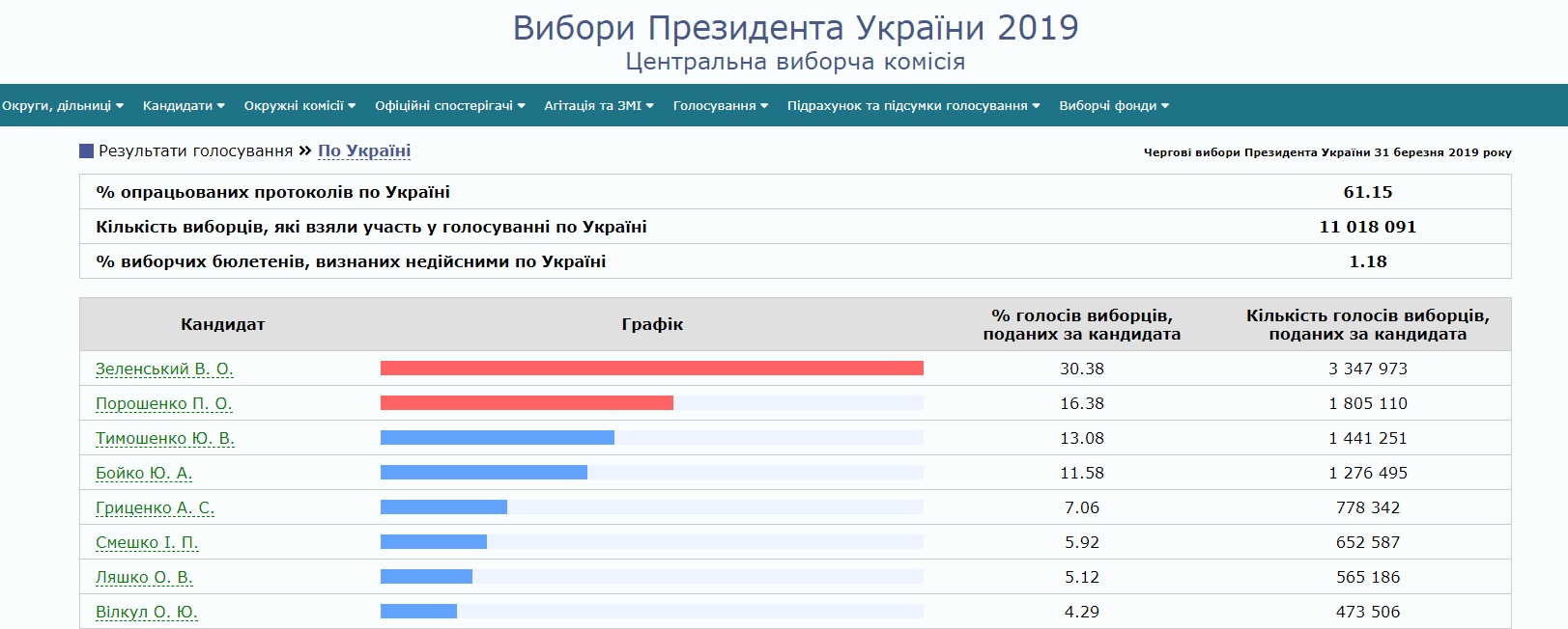 По результатам обработки 61,15% бюллетеней лидерство в первом туре президентских выборов удерживает шоумен Владимир Зеленский