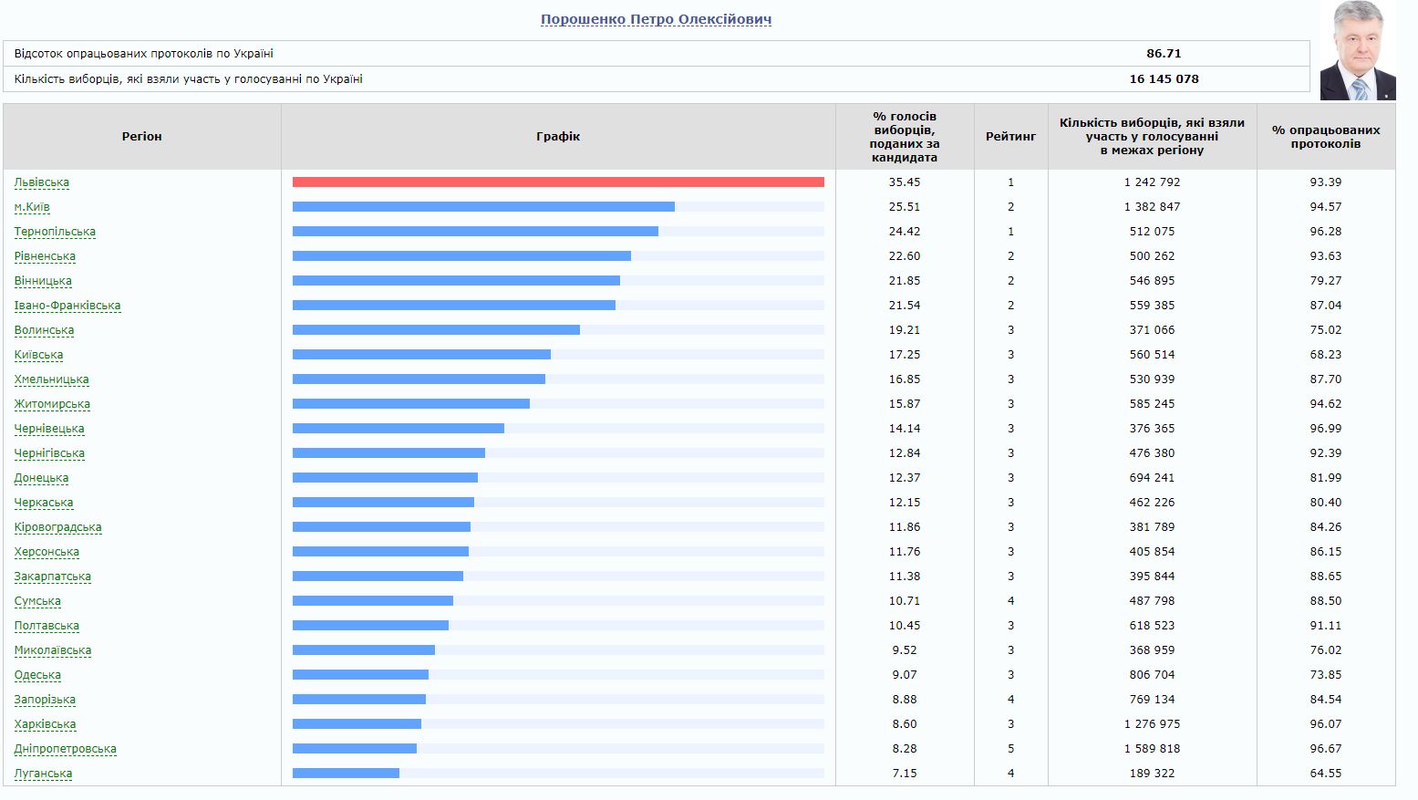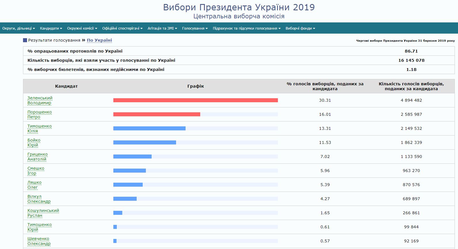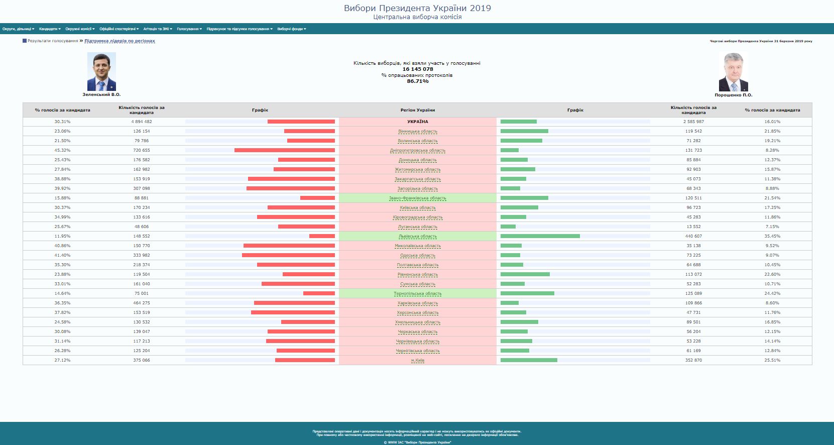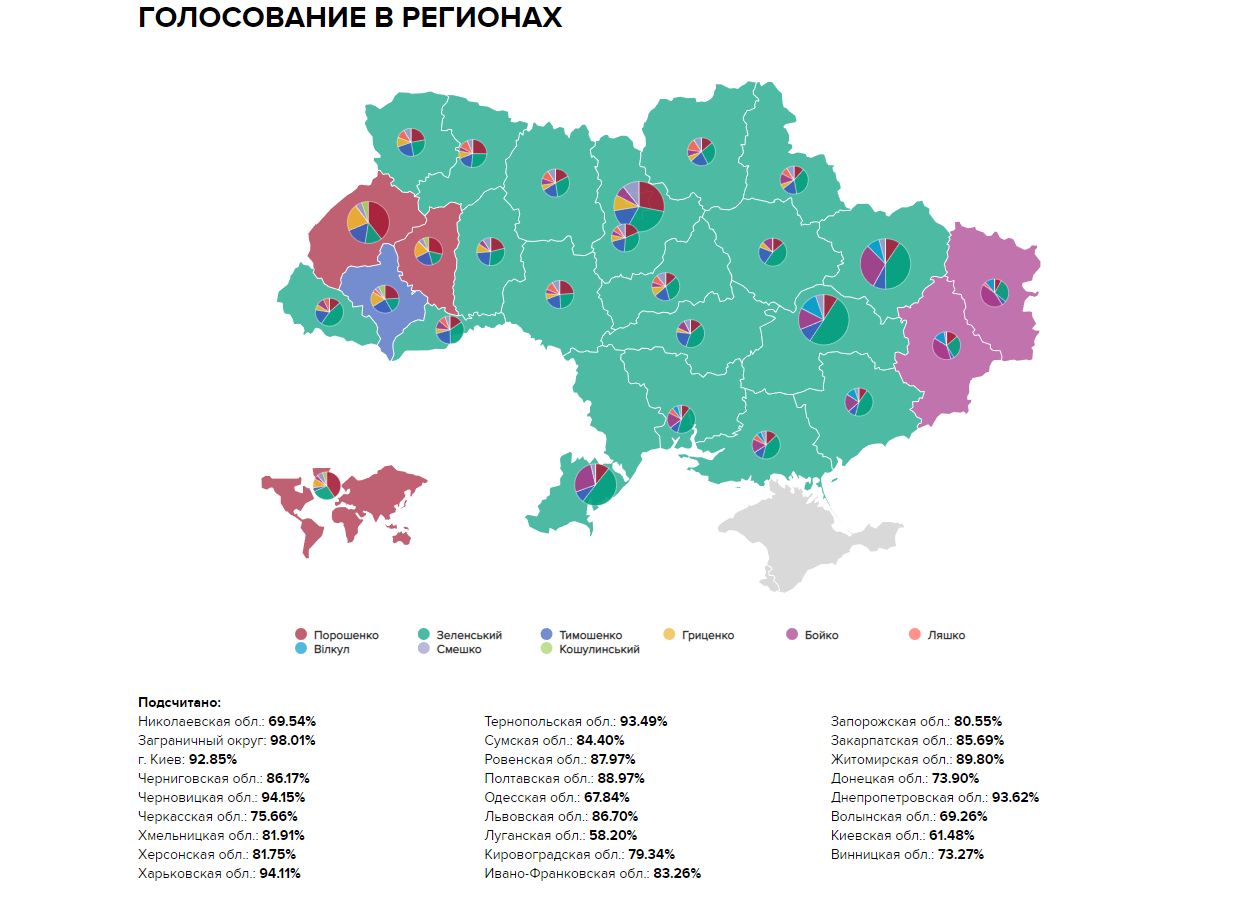 По результатам подсчета более 85% голосов лидером остается Зеленский 1 апреля 2019 17:09 Об этом свидетельствуют данные ЦИК. Пока еще действующий президент Украины Петр Порошенко смог набрать большинство лишь в трех областях Украины. В большинстве областей Петру Порошенко не удалось даже войти в "двойку" лидеров президентской гонки.