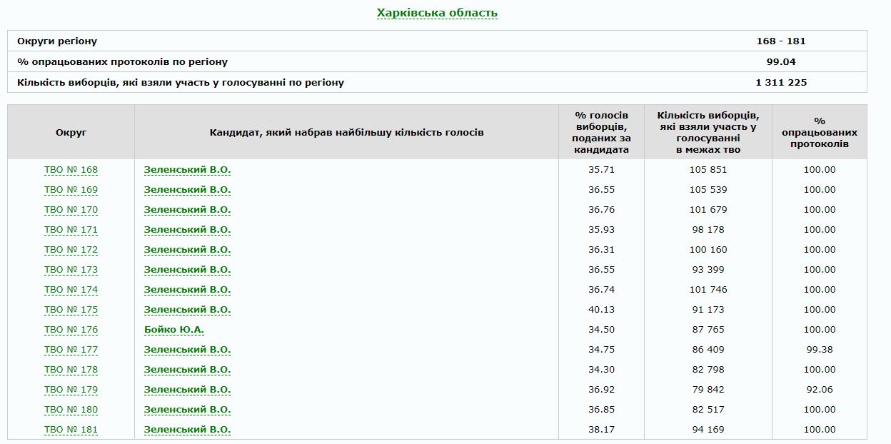 На Харьковщине осталось обработать менее 1% голосов избирателей: побеждает Зеленский 1 апреля 2019 21:18 Об этом по состоянию на 21.15 01 апреля говорят данные, опубликованные на сайте ЦИК. Зеленский побеждает во всех округах области, за исключением одного: