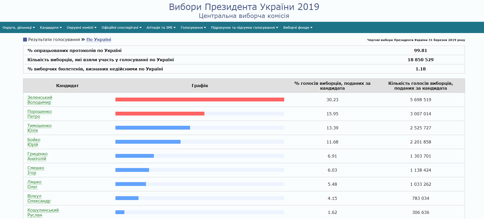 Центральная избирательная комиссия подсчитала 99,81% бюллетеней избирателей, проголосовавших в первом туре выборов президента Украины.