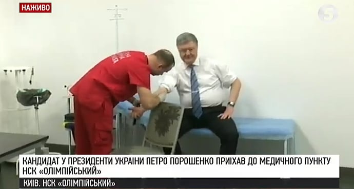 Фотофакт: Порошенко сдал анализы 5 апреля 2019 09:38 Президент Петр Порошенко сдал анализы в медпункте НСК "Олимпийский". Глава государства приехал в 9:23 хотя своего соперника на выборах Владимира Зеленского звал на 9 утра.