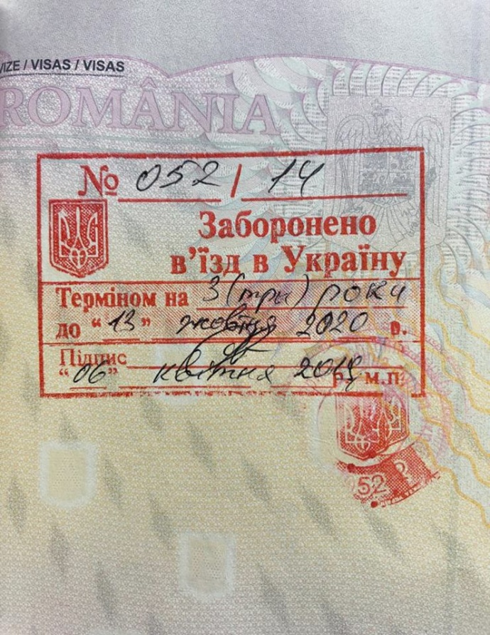 Политик также представил фотографию страницы своего паспорта со штампом о запрете въезда в Украину сроком на три года до 13 октября 2020 года и призвал украинского посла представить подобные документы о предыдущих его попытках въехать в Украину.