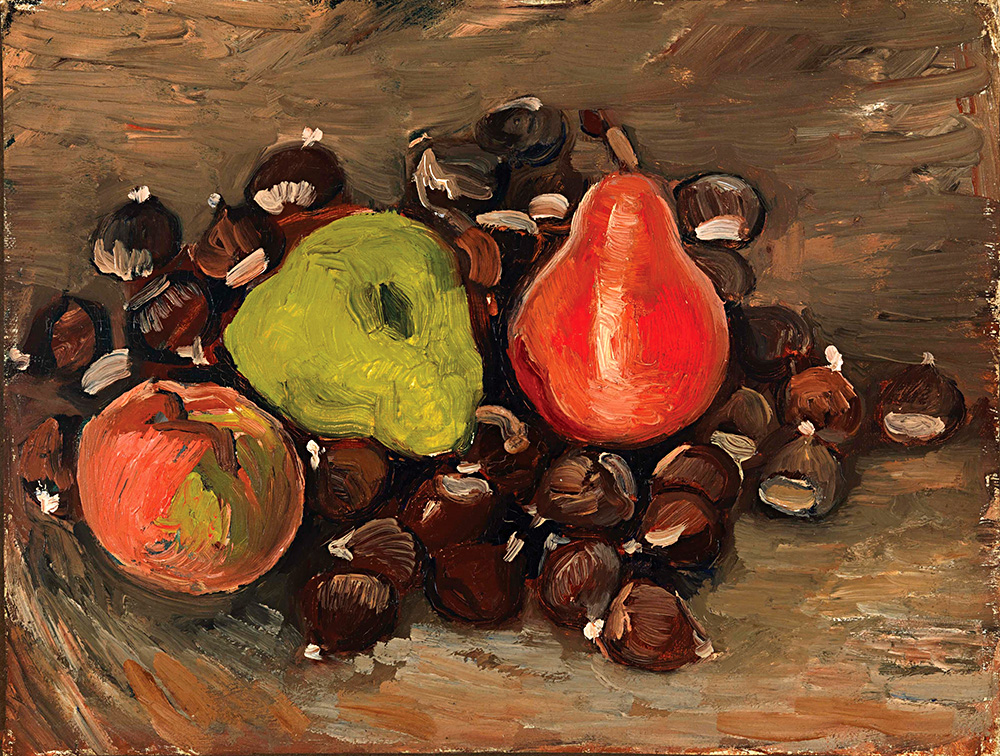 Надпись на обороте «Натюрморта с фруктами и каштанами» (холст, масло) гласит: „Nature mort, peint par Vincent van Gogh“ («Натюрморт, написанный Винсентом ван Гогом»). Картину передали в дар музею в 1960 году калифорнийские коллекционеры Бруно и Сэди Адриани. Однако из-за сомнений в ее подлинности, вызванных необычными для того времени оттенками красок, она в основном пылилась в запаснике и не была включена в авторитетные каталога-резоне ван Гога, отмечает theartnewspaper.