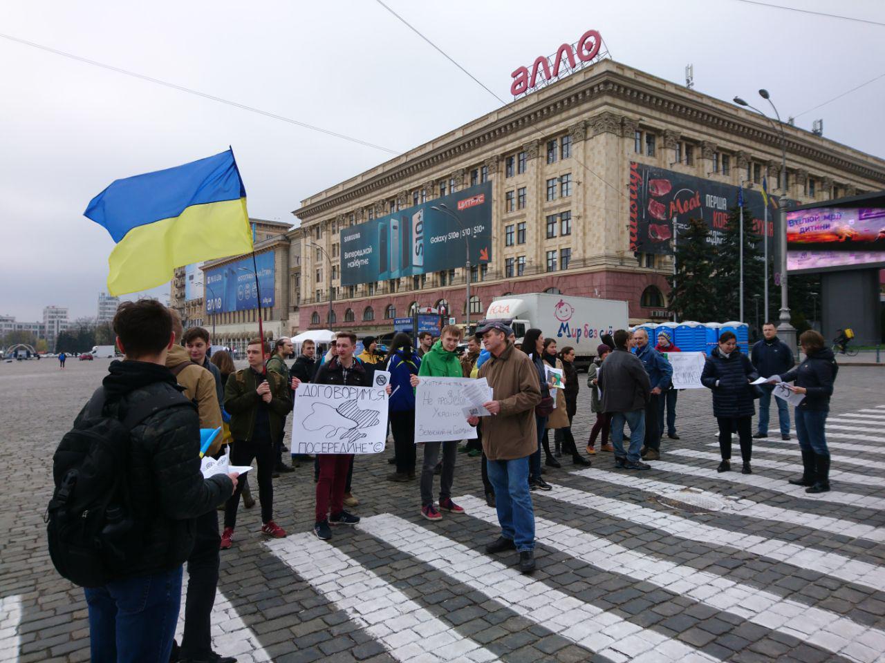Мітингуючі тримали у руках плакати «Договоримся посередине», «Непрозеби Украину» і роздавали листівки, на одній з яких співставлялося обличчя Володимира Зеленського і Віктора Януковича із написом «Выбрали зека, выбирут и Зе. Не вибери Зе.» На листівках було зазначено, що вони надруковані на особистому принтері Ковалівського Р.І тиражом в 100 екземплярів. Відповідальний за випус Ковалівський Р.І, а замовником вказана Д.Зоріна.