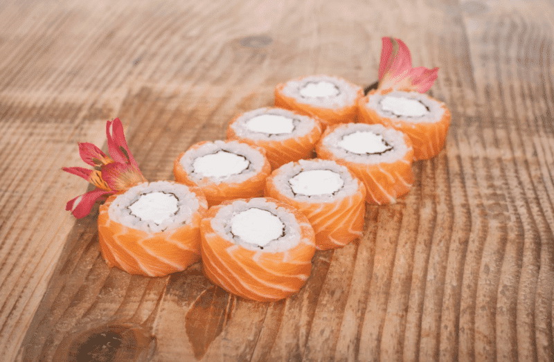 Как вы поняли из названия, главной изюминкой блюда является нежный сыр Филадельфия. Это сытный ролл со свежей начинкой из сыра, огурца и авокадо, сверху обернутый рисом и тонкими слайсами лосося. Роллы получаются достаточно крупными, хорошо утоляют голод, а сочетание разных цветов радует глаз.