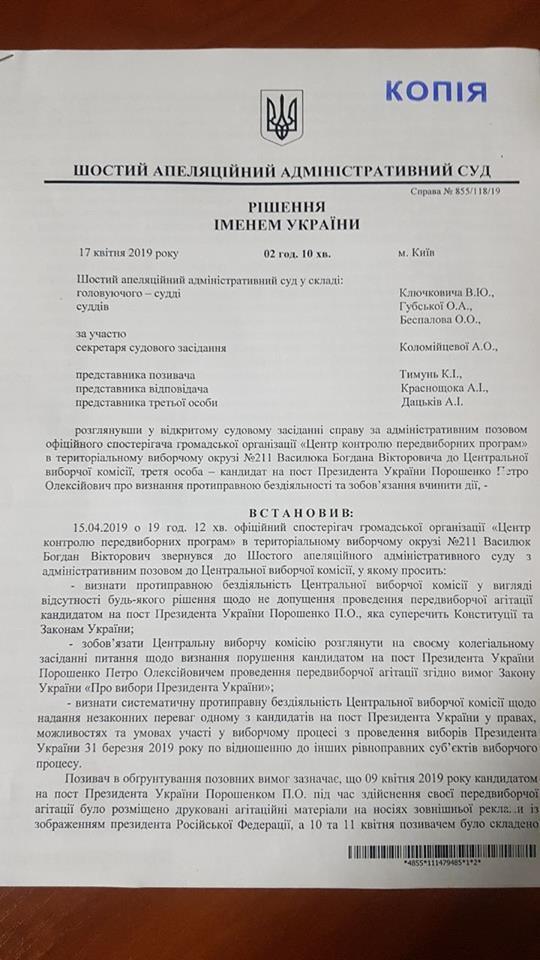 Апелляционный административный суд отклонил иск активистов о привлечении к ответственности Центральной избирательной комиссии и президента Украины Петра Порошенко за агитационные билборды с главой РФ Владимиром Путиным.