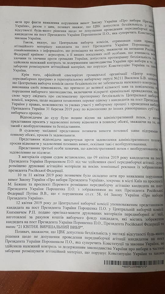 Они утверждают, что ЦИК неоднократно игнорировала нарушения законодательства. "Бездействие ЦИК поражает – и поэтому мы подали иск в суд, в котором требуем признать противоправной бездеятельность ЦИК и то, что Петр Порошенко нарушил закон, когда развесил по стране билборды с Путиным!" – говорится в комментарии, который приводит Обозреватель.