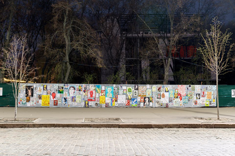 Ночью преподаватели студии наклеили работы на строительные заборы в центре города - вдоль сада Шевченко со стороны площади Свободы и в парке Стрелка.