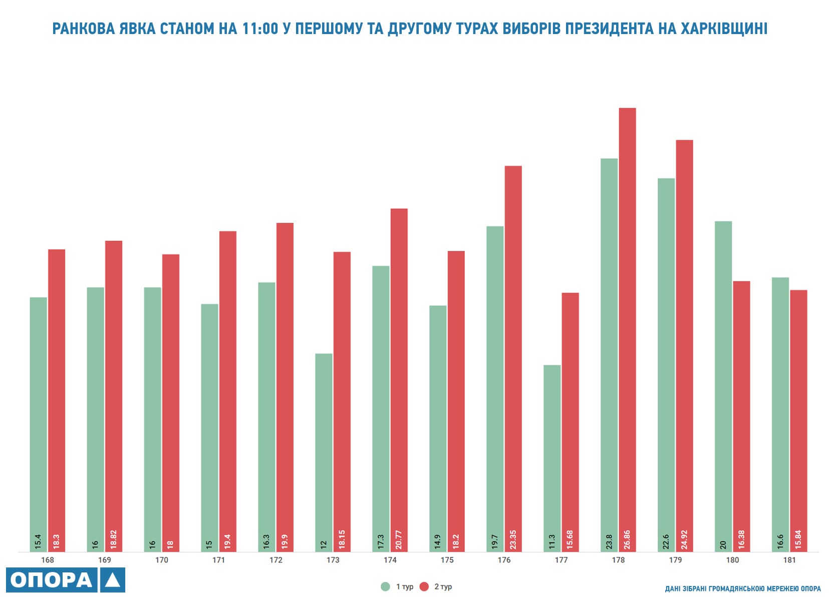 Порівняно з першим туром підвищилась ранкова явка: якщо 31 березня станом на 11:00 на дільниці прийшли 15,47% виборців, то 21 квітня ця цифра зросла до 19,63%. Явка більше 20% зереєстрована на 174, 176, 178, та 179 округах, а найменше виборців прийшло на дільниці в 181 окрузі — 15,84%.