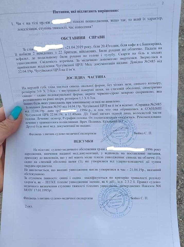 В тоже время, на странице в соцсети "Честно про Чугуев" местные жители пишут о том, что девушку избили бойцы 22 бригады ВСУ: