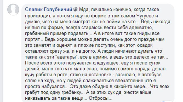 Требуем от руководства ВСУ, от военной прокуратуры и руководства Чугуевской полиции, обратить внимание на данный инцидент, и привлечь к ответственности всех без исключения.