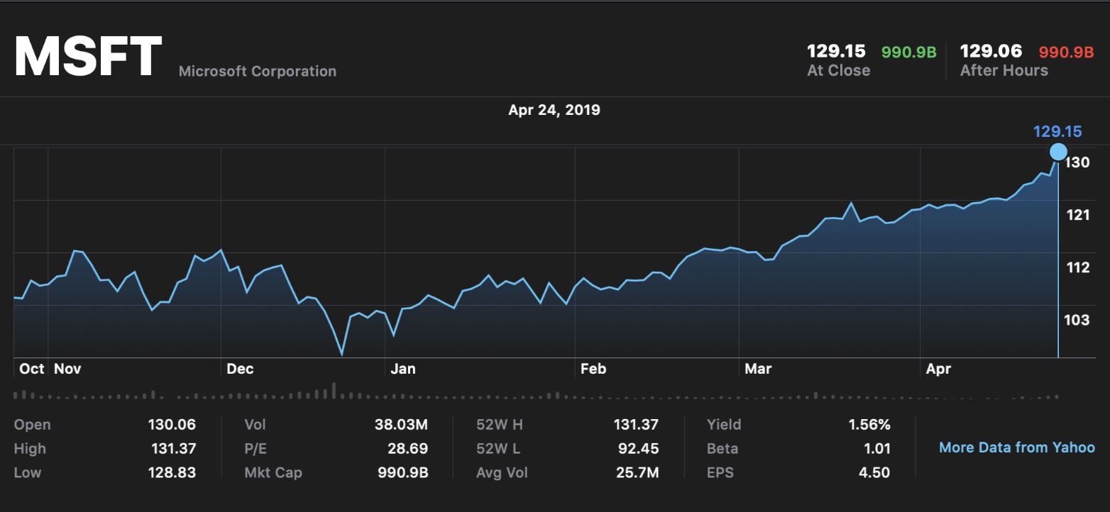 Microsoft заняла первое место в рейтинге самых дорогих публичных предприятий — вечером 25 апреля капитализация компании превысила $1 трлн. Сейчас ценные бумаги незначительно упали в цене, капитализация на момент написания текста — $990 млрд.
