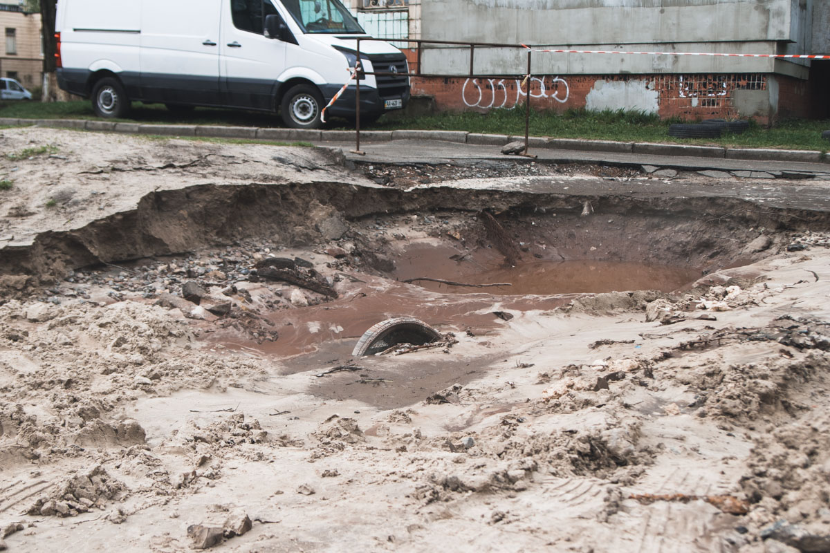 В четверг, 2 мая, около 6 утра, на улице Симиренко, 7 в Киеве прорвало трубу горячего водоснабжения, в результате чего детскую площадку затопило кипятком, а автомобиль, который стоял на парковке во дворе, провалилась под асфальт.