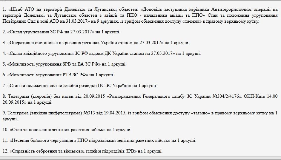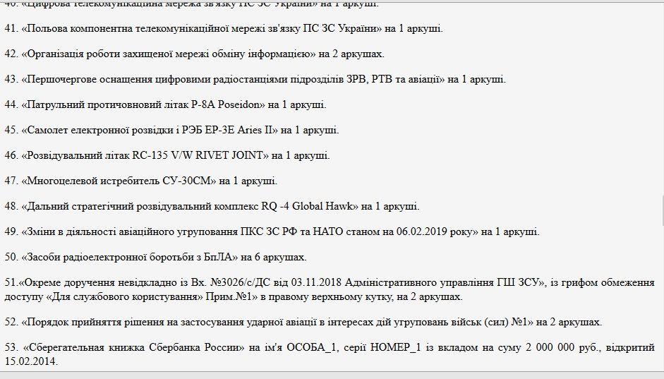 Также по месту жительства изъяты секретные документы, в частности, о применении авиации в зоне АТО/ООС, составе группировки российских военных на этой территории, составе российской авиации вдоль украинской границы, возможностях российских Воздушно-космических сил и Зенитно-ракетных войск.