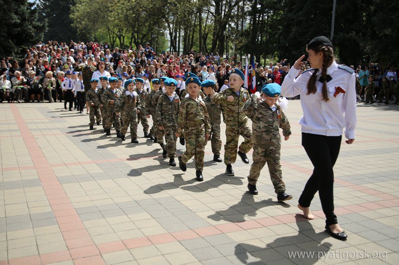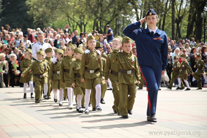 В Пятигорске воспитанники детских садов в форме пехотинцев, танкистов, летчиков, моряков, артиллеристов и медсестер промаршировали по площади у Вечного огня.