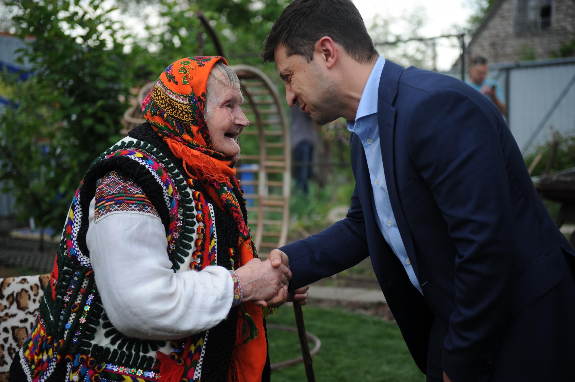 На этой фотографии ветераны пожимают друг другу руки в присутствии В.Зеленского.