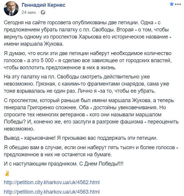 Об этом харьковский городской голова Геннадий Кернес написал на своей странице в соцсети: