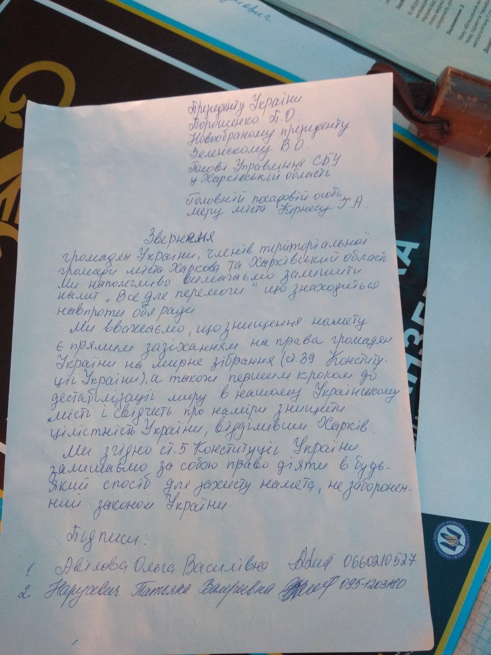 Между тем, харьковчане, пришедшие сегодня на вече в защиту палатки волонтеров, подписывают обращение к избранному президенту Владимиру Зеленскому и харьковскому градочачальнику Кернесу о сохранении палатки "Всё для победы".