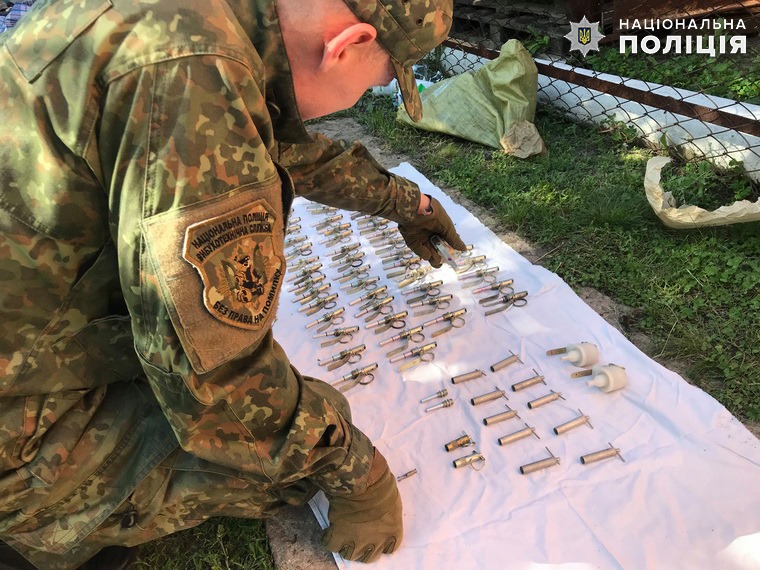 На місце знахідки негайно були викликані спеціалісти вибухотехніки та слідчо-оперативна група, які вилучили з гаражу п’ять реактивних гранатометів (РПГ-22 та РПГ-26), шість автоматів Калашникова, 57 гранат (РГД-5, Ф-1, РГО, РКГ), три протипіхотні міни МОН-50, 53 запалів до гранат, 5 запалів до мін, 36 магазинів до АК, 15 сигнальних ракет та близько 11 000 набоїв різного калібру.
