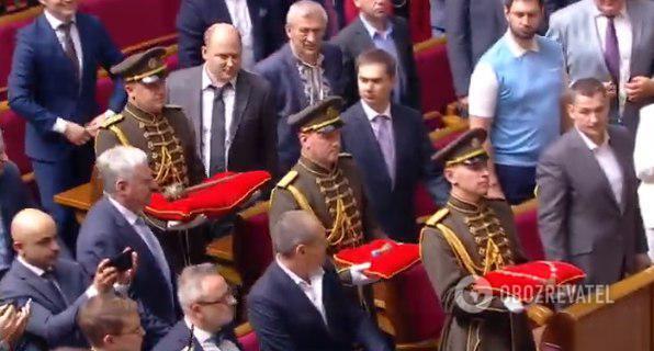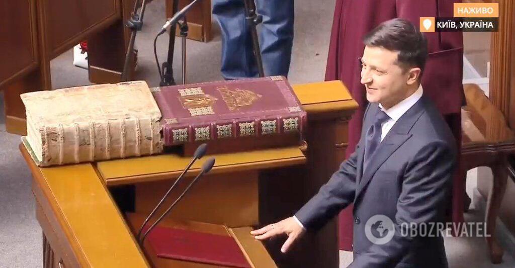 Зеленский положив руку на Пересопницкое Евангие и Конституцию, провозгласил присягу украинскому народу, подписал ее текст и передал главе Конституционного суда Украины.