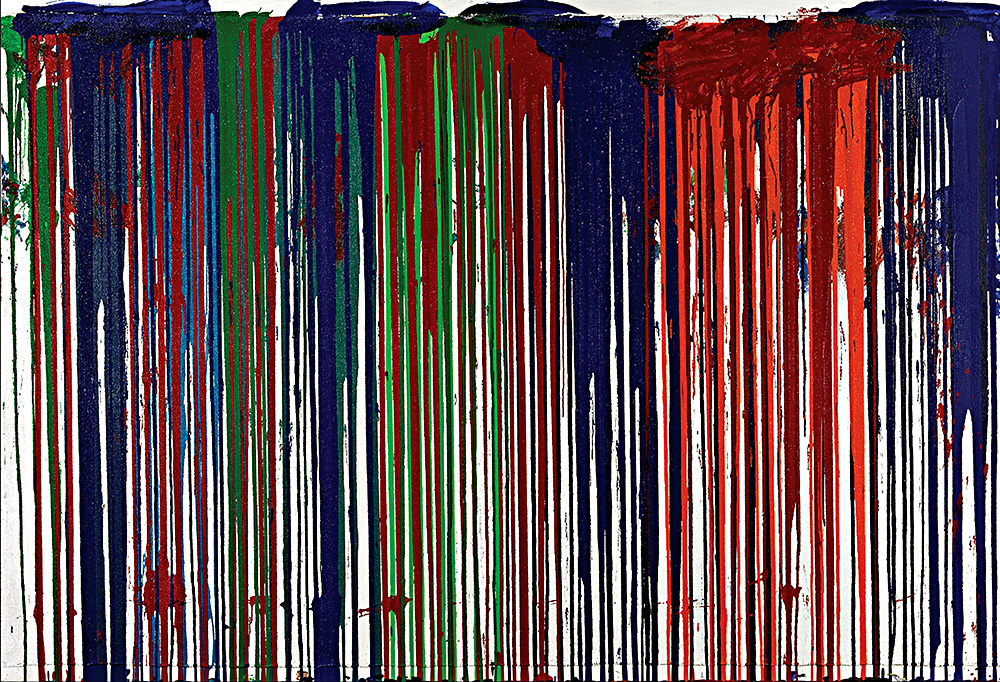 Никаких «кровавых» перформансов от создателя «Театра оргий и мистерий»! Более того, Альбертина предлагает воспринимать абстракции самого знаменитого венского акциониста и перформансиста Германа Нитча (р. 1938) не как часть большого целого или дополнение к его акциям, а просто как картины сами по себе. Мало кто сегодня уже помнит, что Нитч начинал как живописец, учился в начале 1950-х в школе живописи и графического искусства в Вене, чтобы стать художником, да еще писать картины на религиозные темы. Акционистом он стал уже в конце 1950‑х. Но занятия живописью, которую Альбертина показывает первой, по крайней мере столь подробно, никогда не оставлял. И тем не менее полотна размером 2х3 м, которые сам художник называет Schüttbild (если буквально — «созданные наливанием») или «живописными акциями», являют собой не столько картины, сколько огромные тотальные инсталляции. Примерно в 1960 году Нитч написал свою первую картину под названием «Брызги». С тех пор художник постоянно экспериментирует то с жидкой краской, то с пастообразной, разбрызгивая или распыляя ее, а иногда просто размазывая голыми руками по холсту.