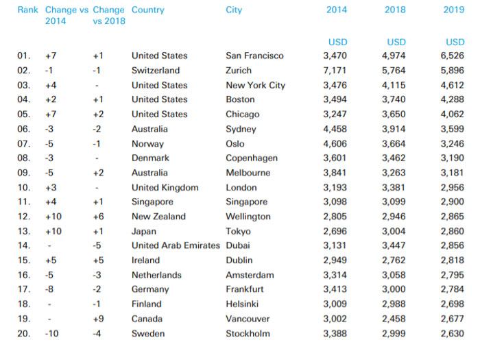 Рейтинг городов с самыми высокими зарплатами в мире, согласно исследованию Deutsche Bank, возглавил Сан-Франциско. А самый высокий уровень жизни, согласно тому же исследованию − в Цюрихе.