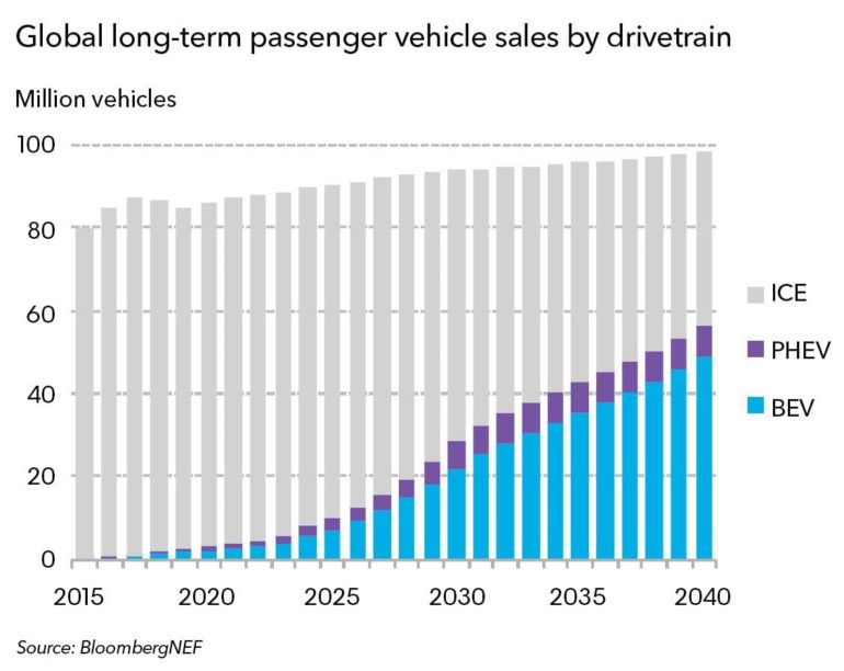 Аналитики ожидают, что по итогам 2019 года будет зафиксирована отметка в 2,6 млн электромобилей, в 2025 году будет впервые побита планка 10 млн электромобилей в год, в 2030 году будет продано 28 млн экземпляров, а в 2040 году — 56 млн экземпляров. Естественно, чем активнее будут расти продажи электромобилей, тем сильнее будут падать продажи бензиновых и дизельных автомобилей.