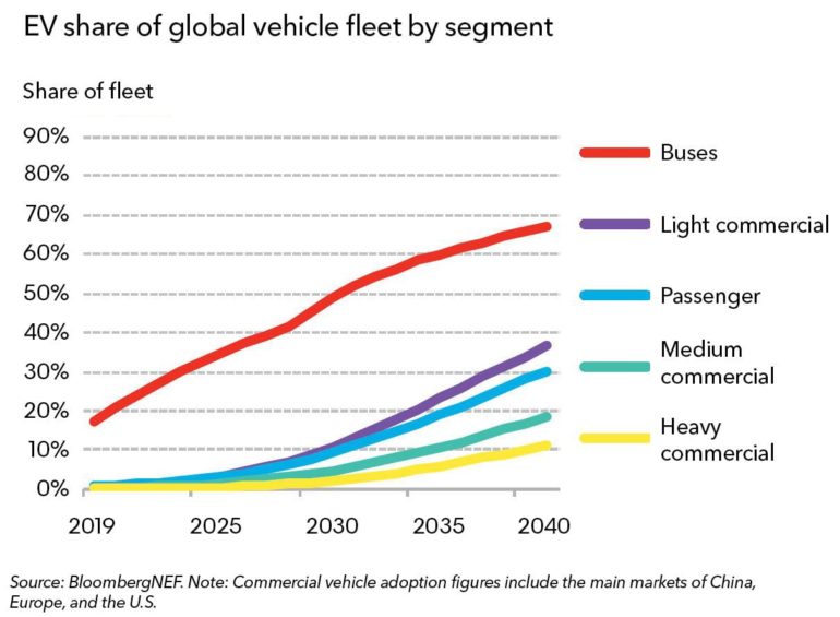По данным Bloomberg NEF, в мире уже насчитывается порядка 400 тыс. электрических автобусов в рамках систем общественного транспорта, что составляет порядка 20% всего коммерческого пассажирского автопарка. При этом в данном сегменте рост будет идти еще активнее, чем в случае с пассажирскими электромобилями — уже к 2030 году электрических автобусов будет больше, чем классических, а к 2040 году их доля повысится до 70%.