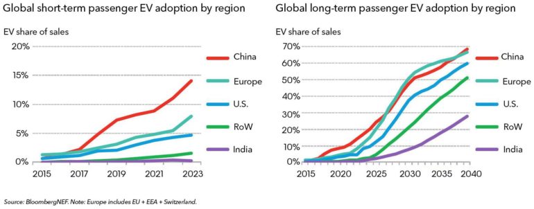 Прогноз Bloomberg NEF гласит, что темпы продаж электрических моделей будут активно расти и уже к середине 2030-х годов электромобили превзойдут по продажам ДВС-модели, а к 2040 году — займут порядка 57% рынка продаж.