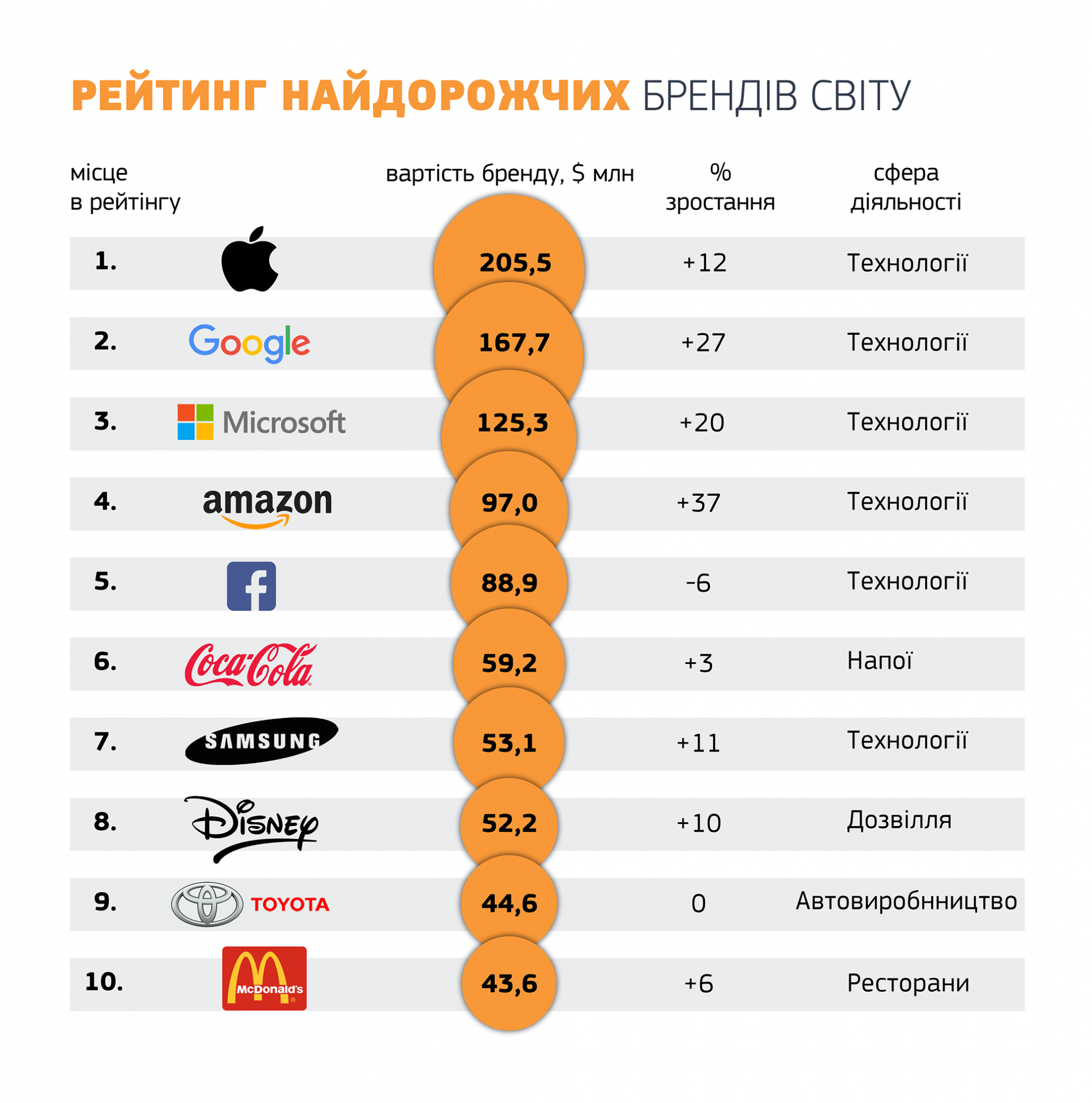 Apple заняла первую позицию в рейтинге, ее стоимость составляет $ 205,5 млрд. Эта сумма на 12% больше, чем в 2018 году.