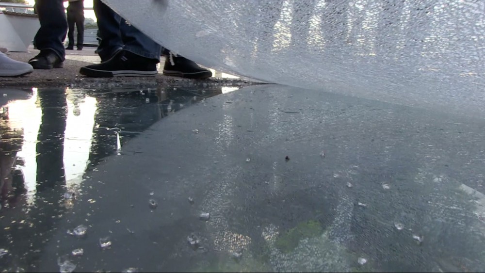 Защитную стекло-пленку, которую повредили вандалы на двух элементах стеклянного пола нового пешеходного моста, восстановят в течение суток.
