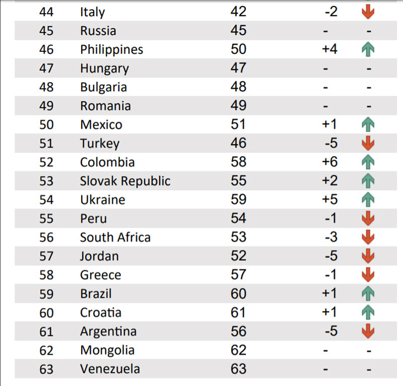 В этом году Украина попала на 54-е место в рейтинге, ее опередили Словакия и Колумбия. В прошлом году наша страна находилась на 59-м месте рейтинга.