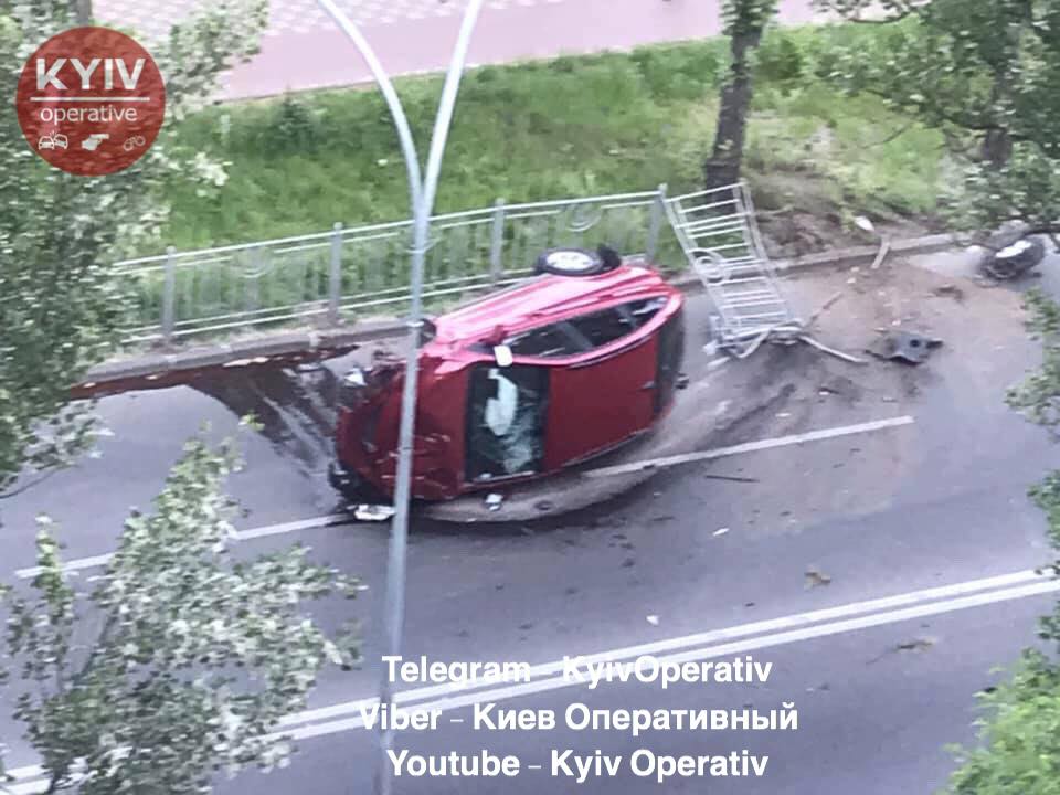 "По предварительной информации, водитель SsangYong не справился с управлением и въехал в ограждение от чего авто перевернулось", - сообщается в группе "Киев Оперативный".