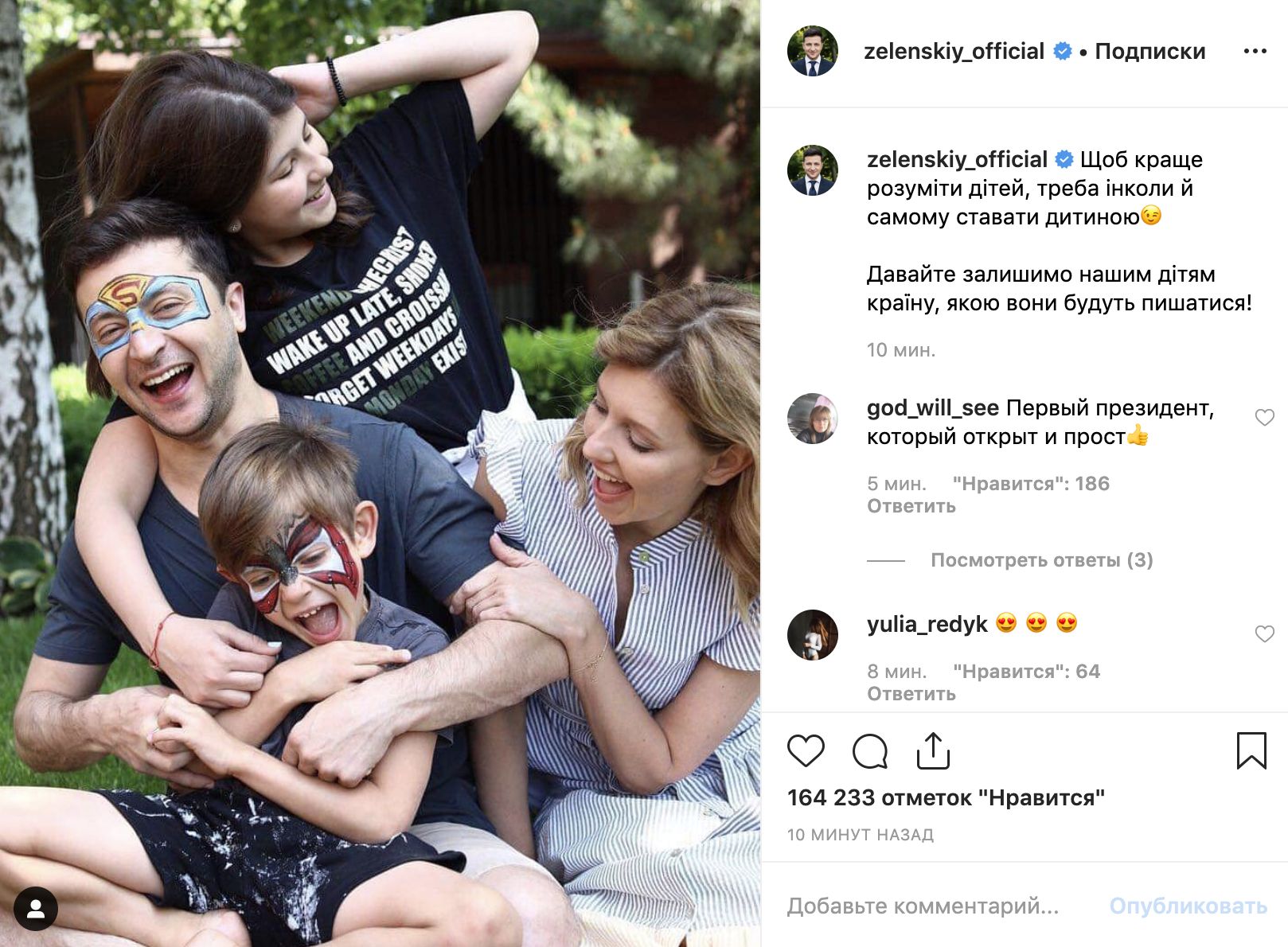В День защиты детей Зеленский выложил в Сеть атмосферное семейное фото 1 июня 2019 11:29 Президент Украины Владимир Зеленский считает, что для того чтобы лучше понимать детей, нужно иногда самому становиться ребенком. "Давайте оставим нашим детям страну, которой они будут гордиться!", - подписал он в Instagram свое семейное фото.