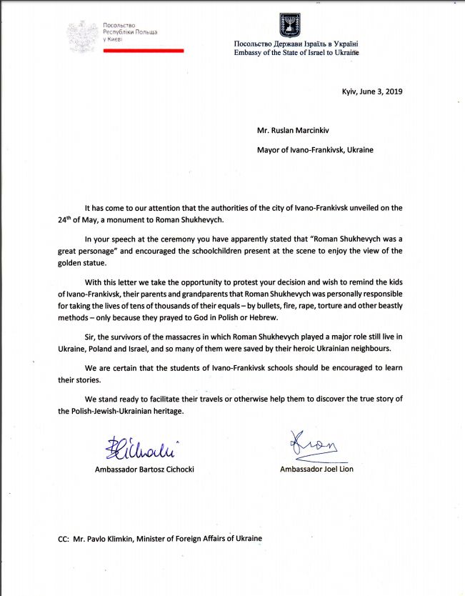 Надзвичайний та Повноважний Посол Держави Ізраїль в Україні пан Джоел Ліона та Надзвичайний та Повноважний Посол Республіки Польща в Україні пан Бартош Ціхоцкий написали спільного відкритого листа до мера міста Івано-Франківськ пана Руслана Марцінківа висловлюючи протест проти відкриття в місті нового пам’ятника Роману Шухевичу.