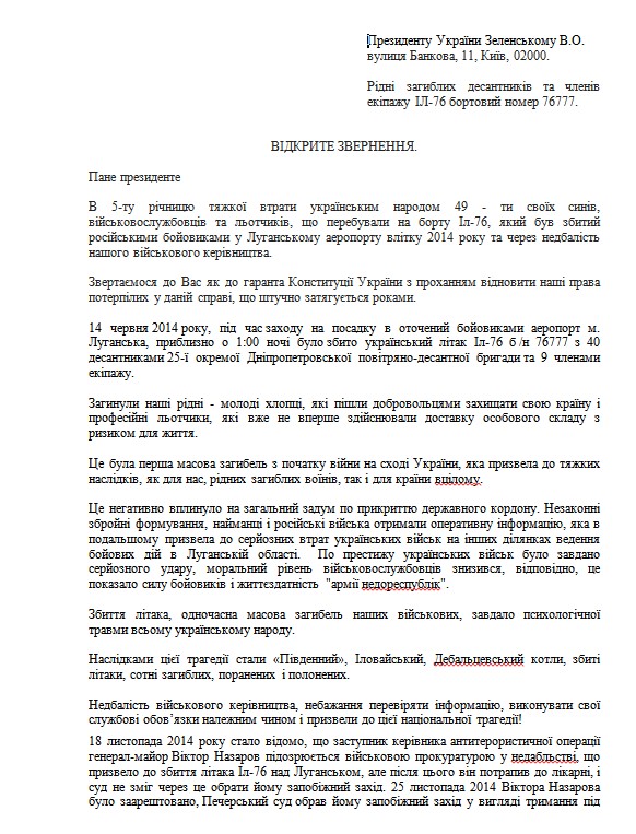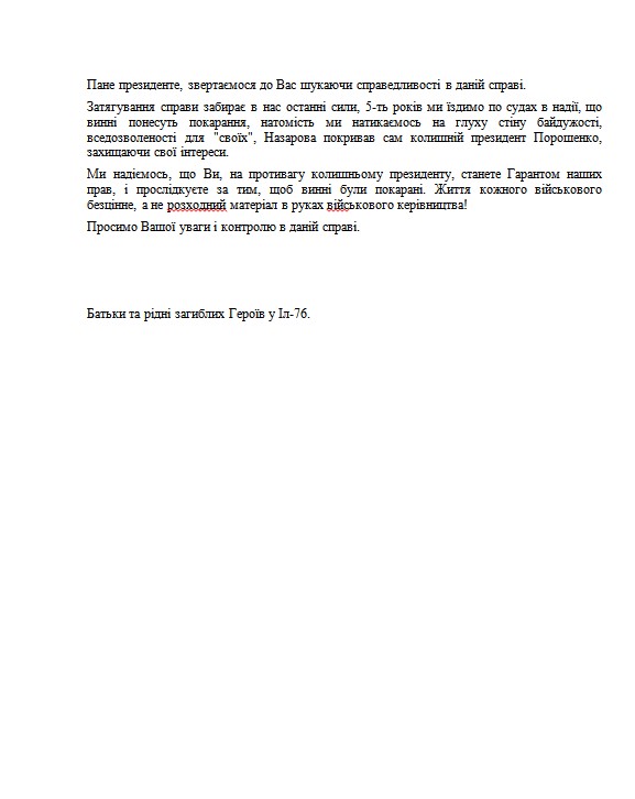 Сейчас подготовлено открытое обращение к президенту Зеленскому по этому поводу. Его просят взять дело под свой контроль. Под обращением - более 40 подписей членов семей погибших.
