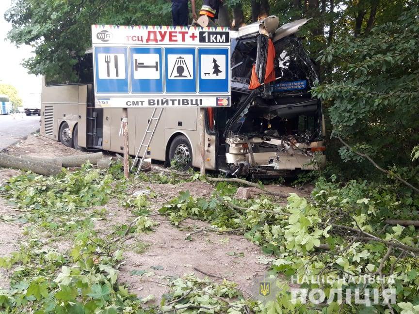 Отмечается, что автобус ударился в заднюю часть прицепа, в результате чего съехал в кювет, где столкнулся с деревом.