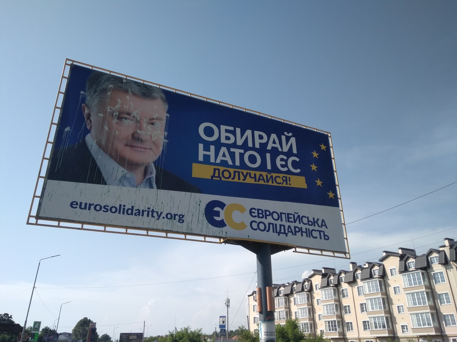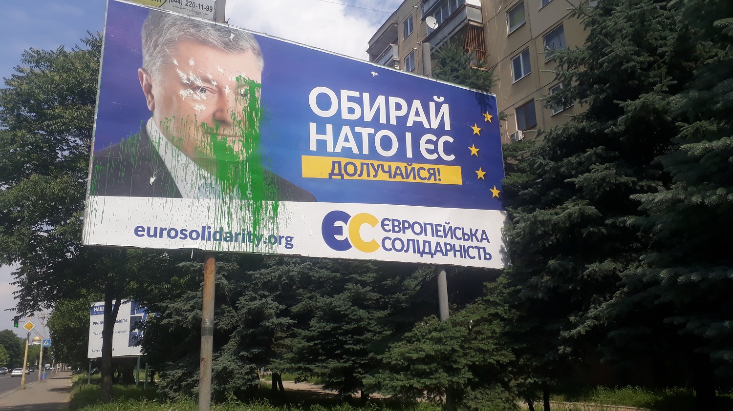 Рекламні білборди «Європейської солідарності», на яких зображене фото Петра Порошенка та напис «Обирай НАТО і ЄС. Долучайся! Європейська солідарність», невідомі облили фарбою. Зокрема, вперше такий борд помітили в Ужгороді 14 червня на вул. Боб’яка. У неділю, 16 червня, обнесені фарбою рекламоносії зафіксовані на вул. Минайській.