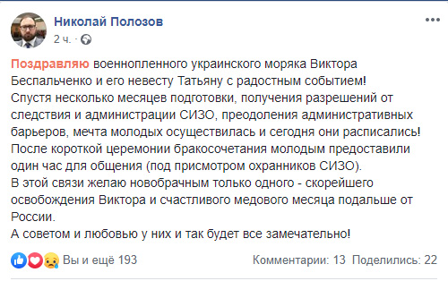 Полозов пожелал новобрачным "скорейшего освобождения Виктора и счастливого медового месяца подальше от России".