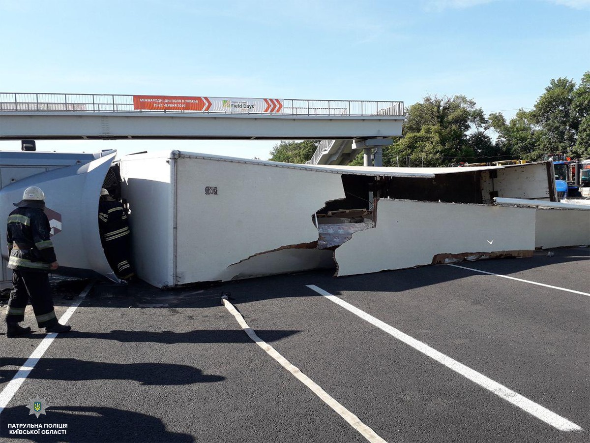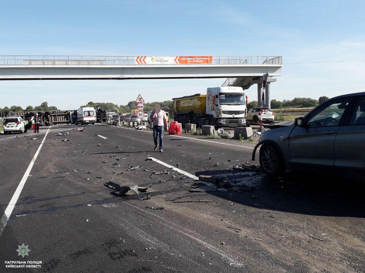 Возле села Гребенки под Киевом на 65 километре трассы Киев-Одесса иномарка BMW X3 столкнулась с грузовиком Renault Magnum 480, в результате фура перевернулась и заблокировала движение. Об этом сообщает патрульная полиция Киевской области.