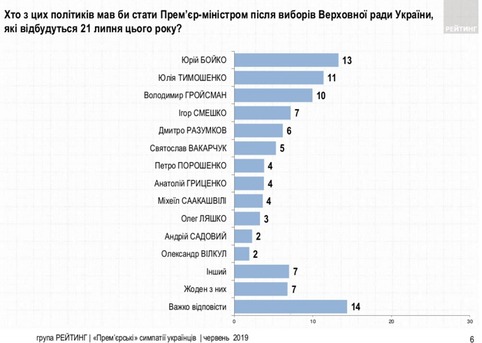 Кроме того, 7% опрошенных видят будущим премьером Игоря Смешко, 6% – Дмитрия Разумкова, 5% – Святослава Вакарчука, по 4% – Петра Порошенко, Анатолия Гриценко и Михеила Саакашвили, 3% – Олега Ляшко, по 2% – Андрея Садового и Александра Вилкула.