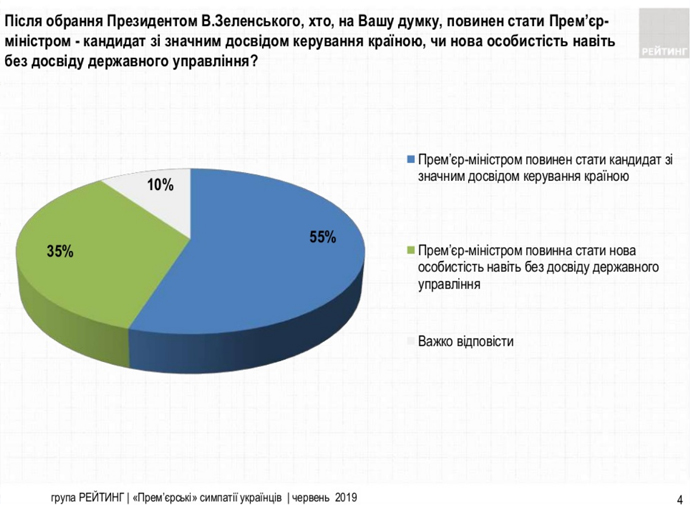 Вместе с тем 55% считают, что будущим премьер-министром должен стать кандидат с большим опытом управления страной, а 35% ожидают новую личность, даже без опыта государственного управления.