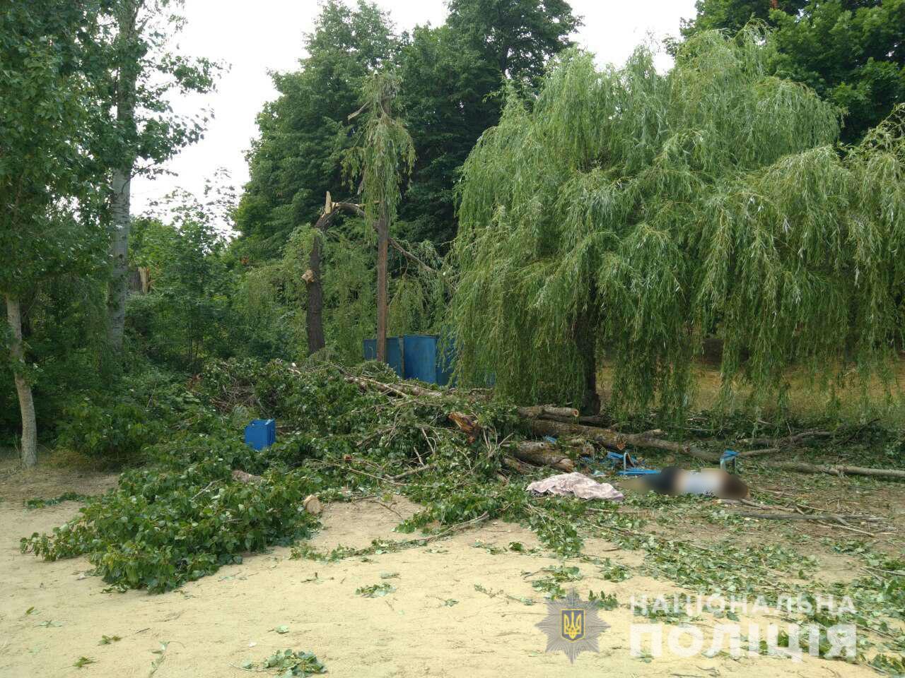 В Старом Салтове на территории базы отдыха в результате порыва ветра на трех отдыхающих упало дерево.