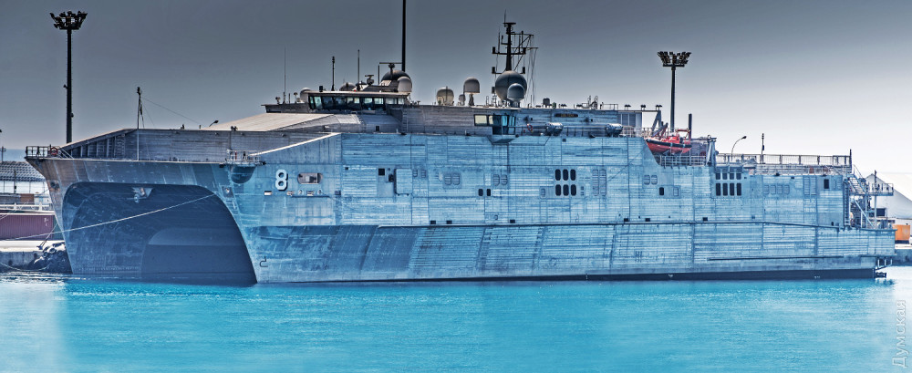 Если с эсминцами типа «Арли Берк» мы хорошо знакомы, то новейший транспортно-десантный корабль одесситы увидят впервые. Катамаран выглядит очень необычно для нашего глаза. Он сделан из легкого алюминиевого сплава и специально не окрашивается.