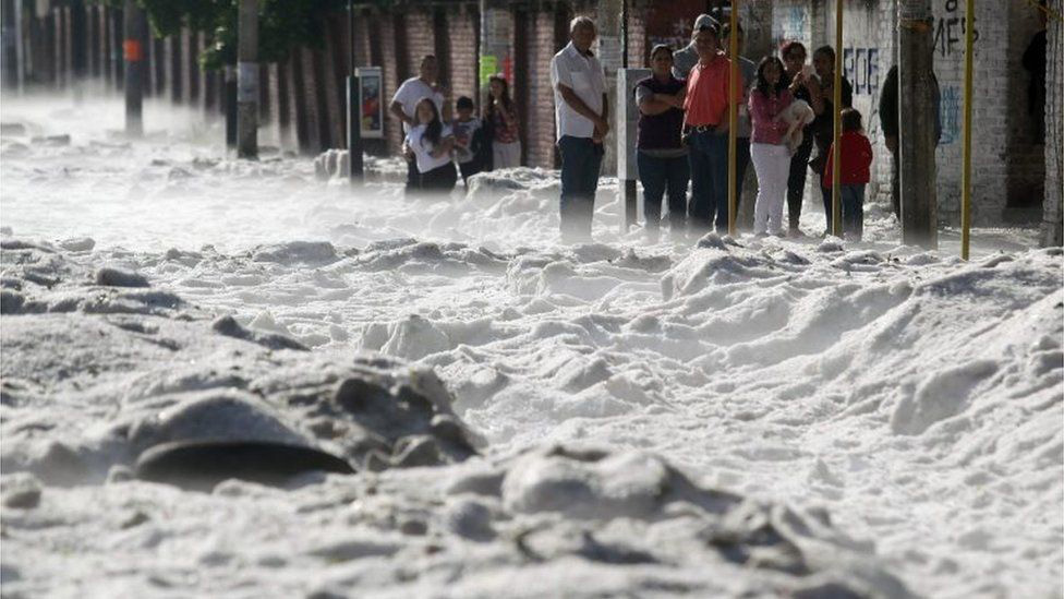 Шесть пригородных районов мексиканского города Гвадалахара неожиданно оказались завалены толстым слоем снега.