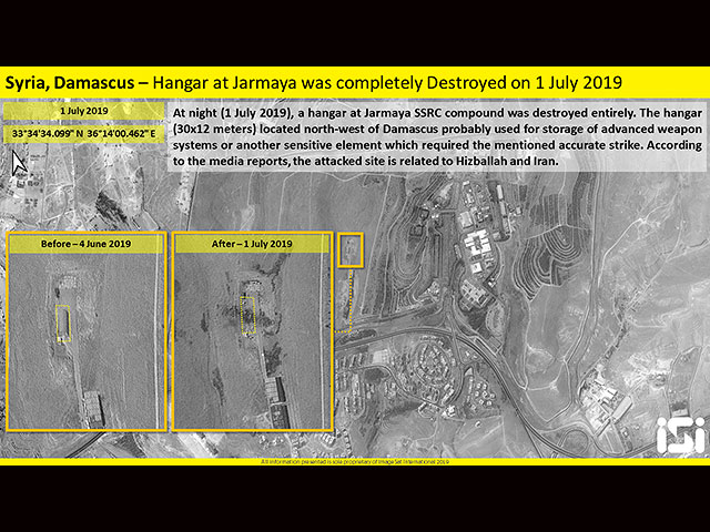 По данным ImageSat, было уничтожено предприятие Сирийского научно-исследовательского центра (Syrian Scientific Studies and Research Center, SSRC), на котором, по всей видимости, разрабатывались и производились продвинутые системы вооружений (возможно, ракетных). Судя по публикациям в оппозиционных сирийских СМИ, этот объект, помещавшийся в ангаре размером 30х12 метров, контролировали иранские военные и ливанская "Хизбалла".