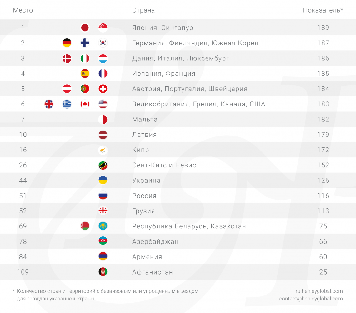 Первое место в Индексе по-прежнему занимают Япония и Сингапур, паспорта которых позволяют посещать без визы 189 стран мира. Южная Корея, которая три месяца назад также была на первой строчке, потеряла две позиции и теперь занимает второе место вместе с Германией и Финляндией (187 стран). Тройку лидеров замыкают Дания, Италия и Люксембург (186 стран).